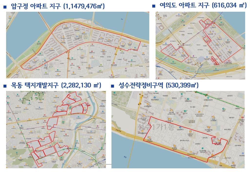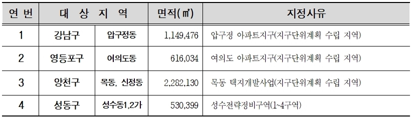´ë»óÁö´Â °­³²±¸ ¾Ð±¸Á¤ ¾ÆÆÄÆ®Áö±¸¿Í ¿µµîÆ÷±¸ ¿©Àǵµ ¾ÆÆÄÆ®Áö±¸, ¾çõ±¸ ¸ñµ¿ ÅÃÁö°³¹ß»ç¾÷ ¾ÆÆÄÆ®´ÜÁö, ¼º¼öµ¿ ¼º¼öÀü·«Á¤ºñ±¸¿ªÀÌ´Ù. Çà´ç Áö¿ªÀº 2027³â 4¿ù 26ÀϱîÁö 1³â°£ ÅäÁö°Å·¡Çã°¡±¸¿ªÁöÁ¤ÀÌ ¿¬ÀåµÈ´Ù.